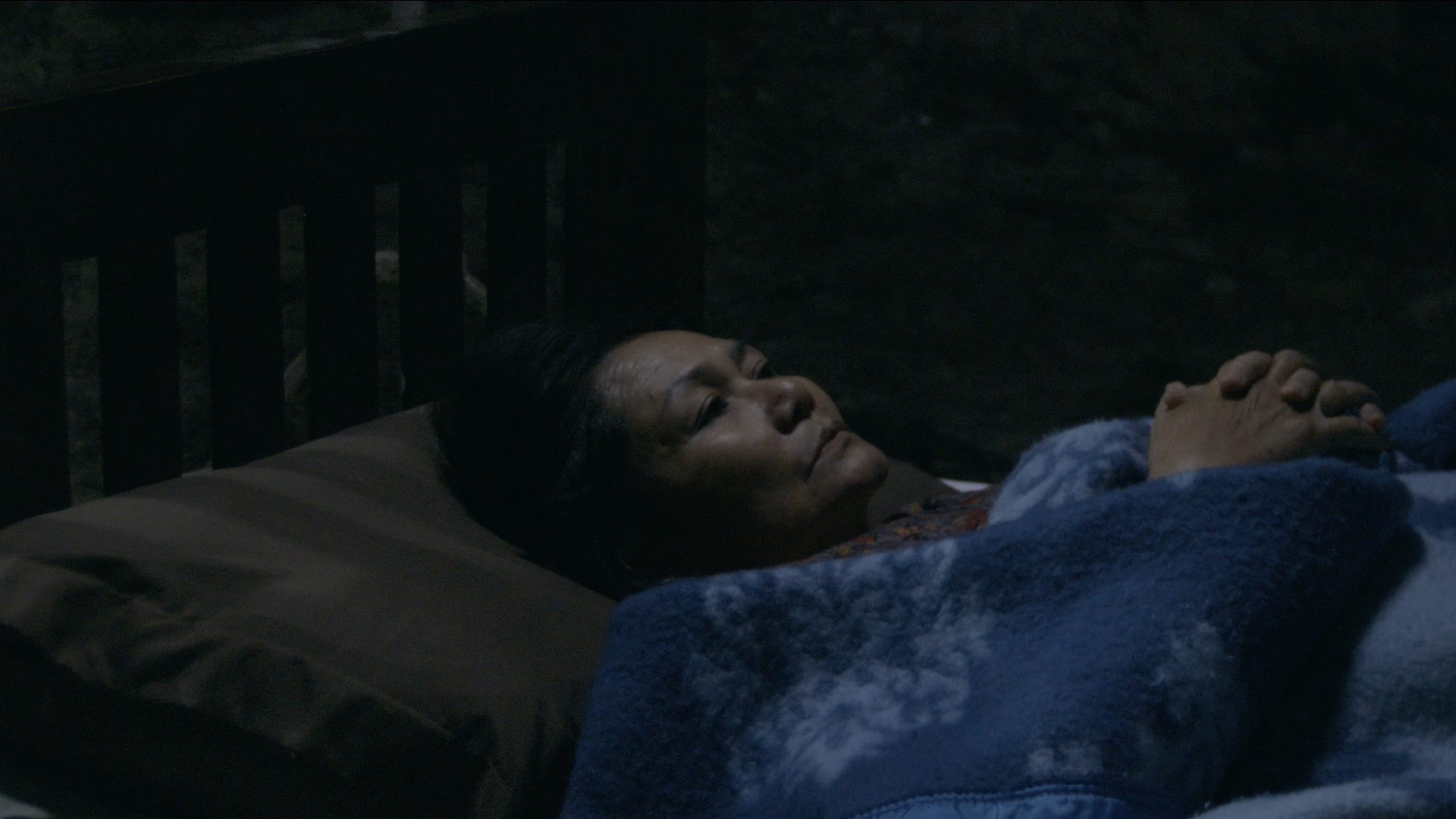 C’est la nuit. Une femme ne trouve pas le sommeil. Près d’elle, une toile de fond se déroule, révélant deux paysages différents. Sur le drap bleu de la femme, une lumière scintillante reflète et illumine le royaume de ses insomnies.